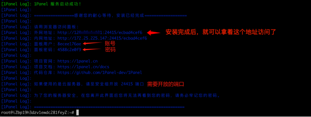 - 出现下面的界面就证明面板安装成功了,请一定记住你的面板账号和密码。
