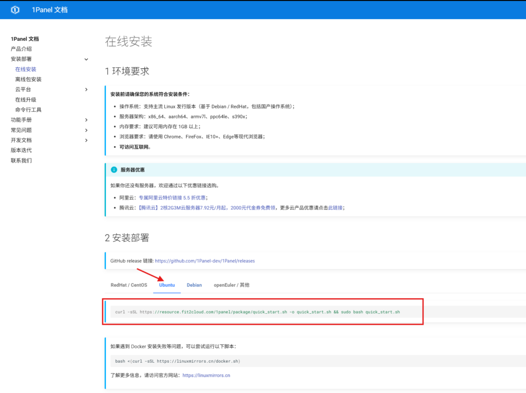 - 访问1Panel面板官网,点击“下载安装”,再“安装部署”一栏找到符合自己服务器系统的安装指令。其中Ubuntu的指令如下: